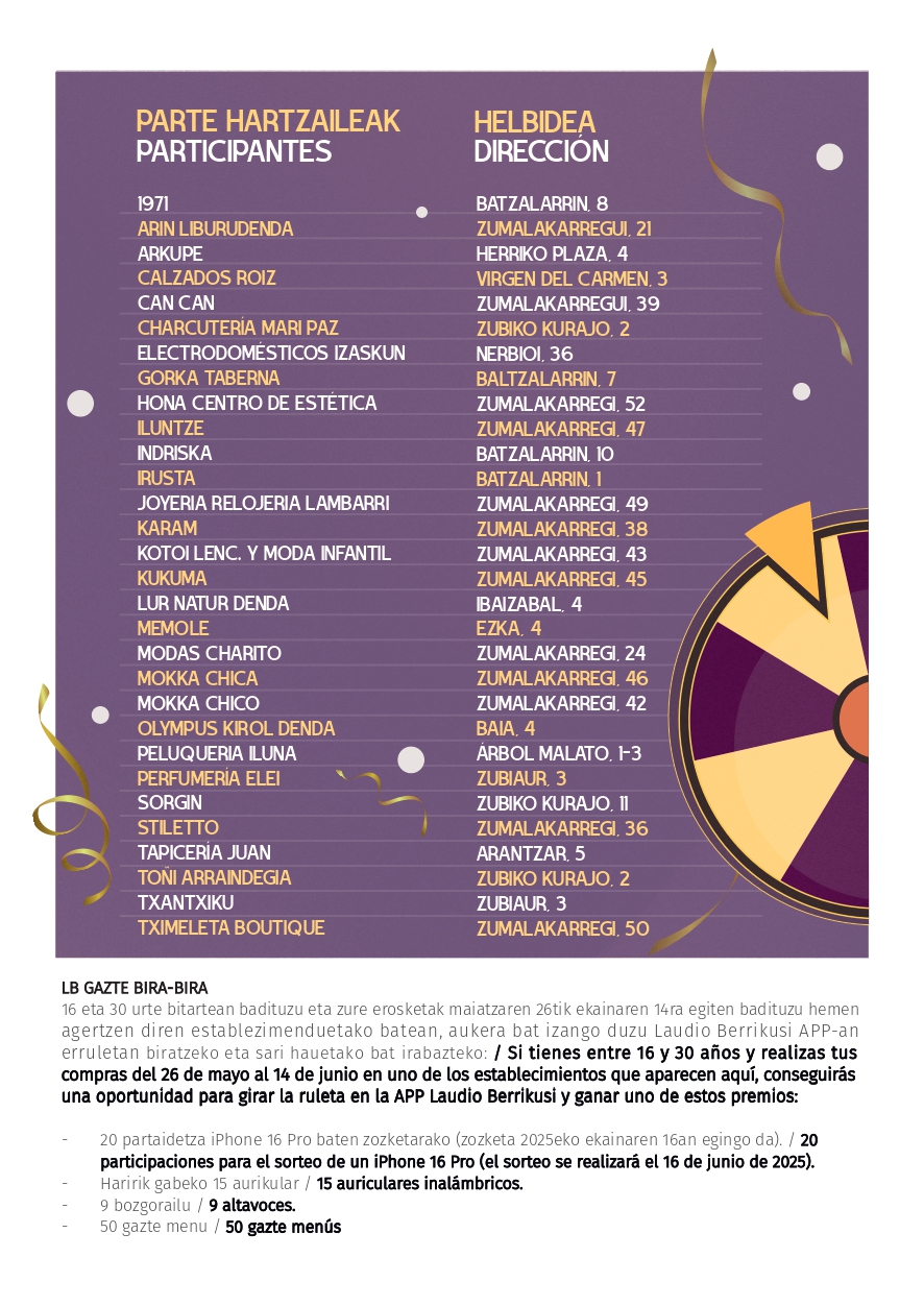 Maiatzaren 26tik ekainaren 14ra bitartean, Laudion erosi besterik ez duzu egin behar parte hartzen duten establezimenduetako batean, eta aukera bat izango duzu erruleta biratzeko eta sari bikaina lortzeko.