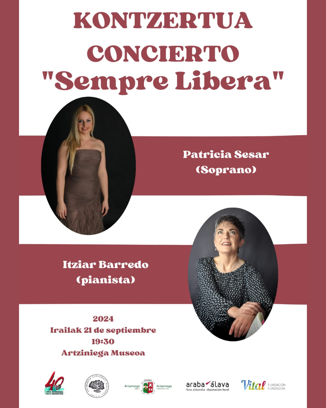 El próximo sábado 21 de septiembre, no te pierdas el concierto "Sempre libera" en el museo. A las 19:30, la soprano Patricia Sesar y la pianista Itziar Barredo te harán disfrutar de una velada inolvidable llena de música y emoción.